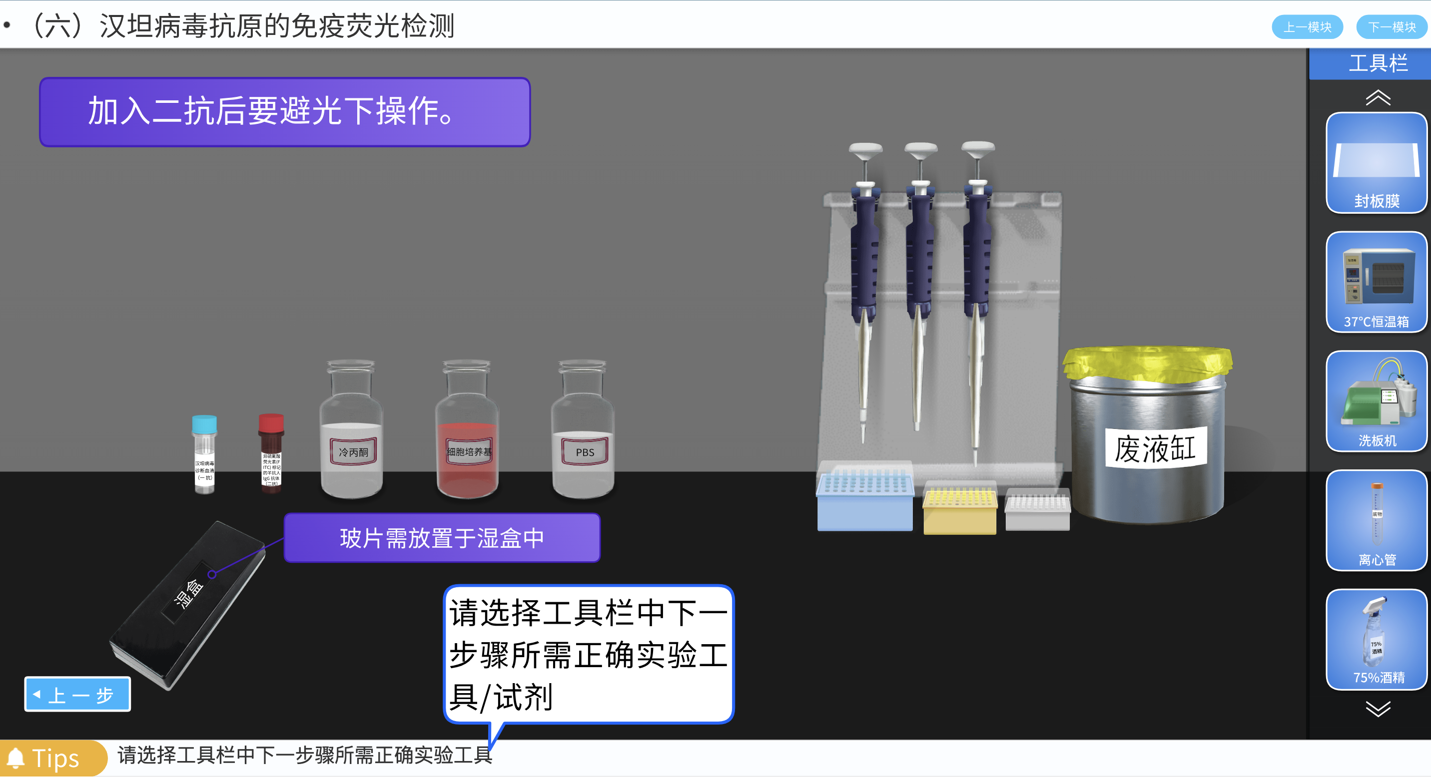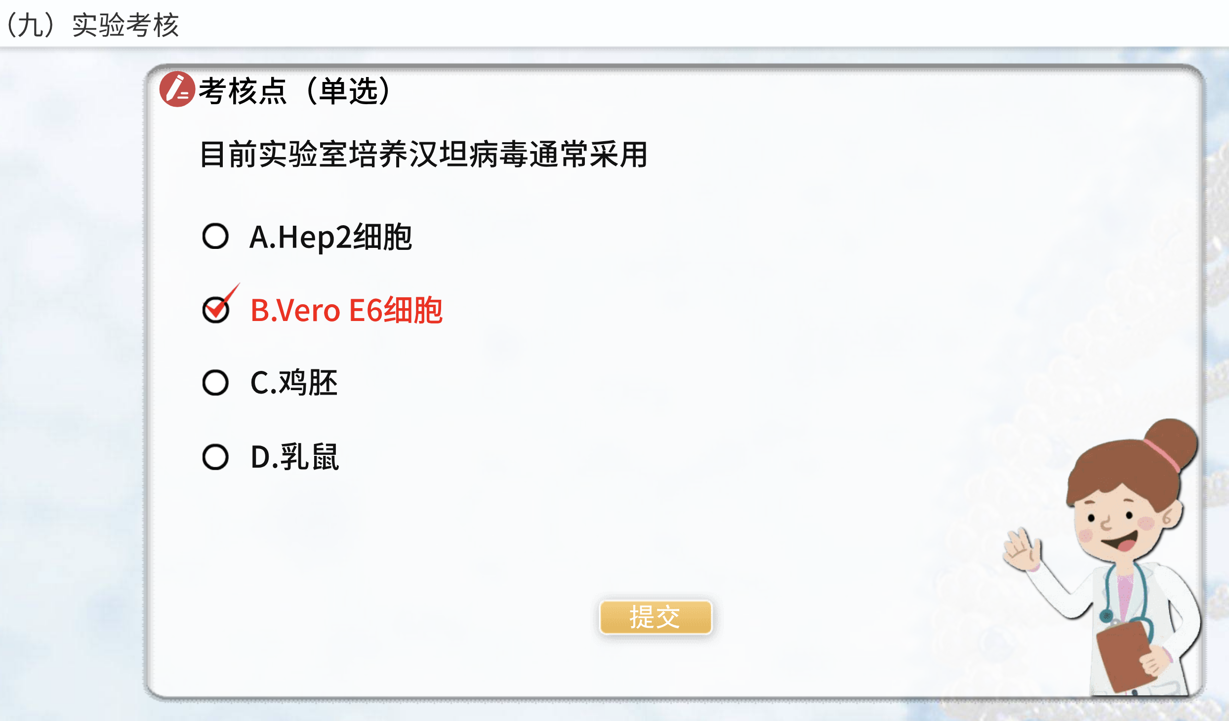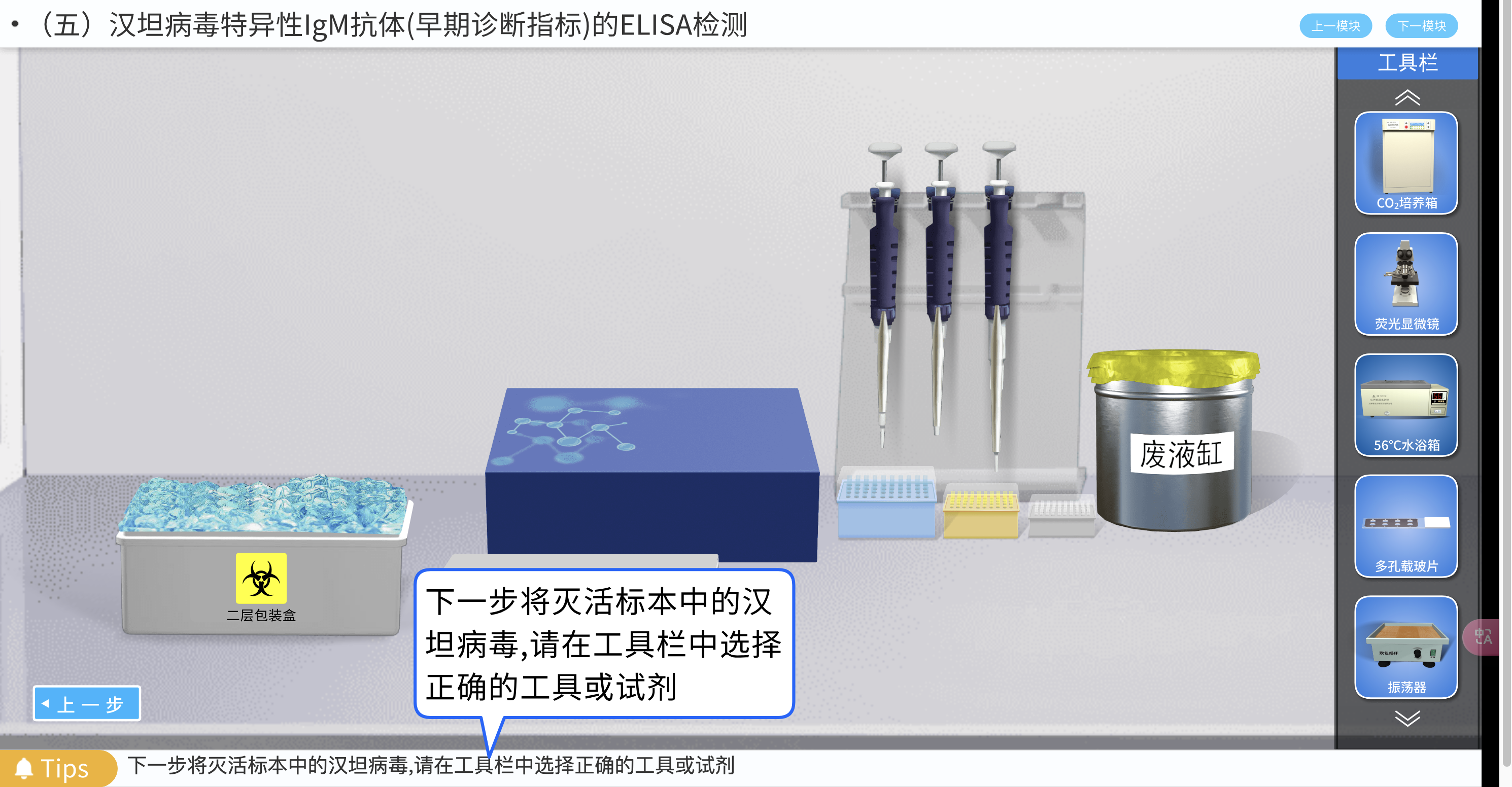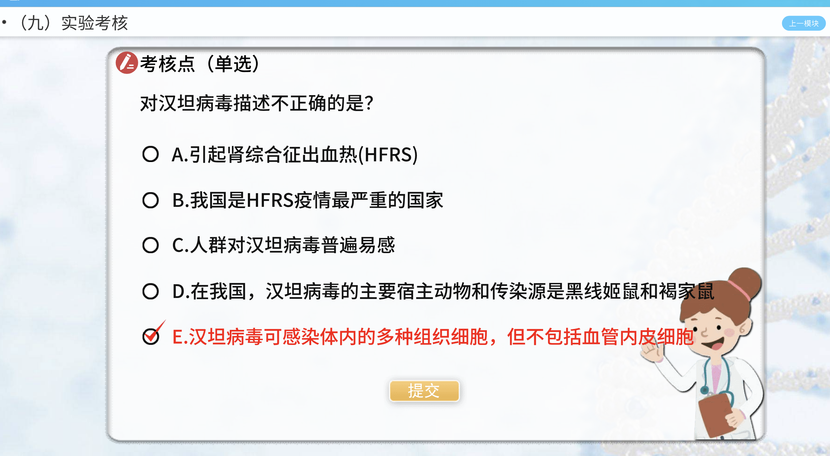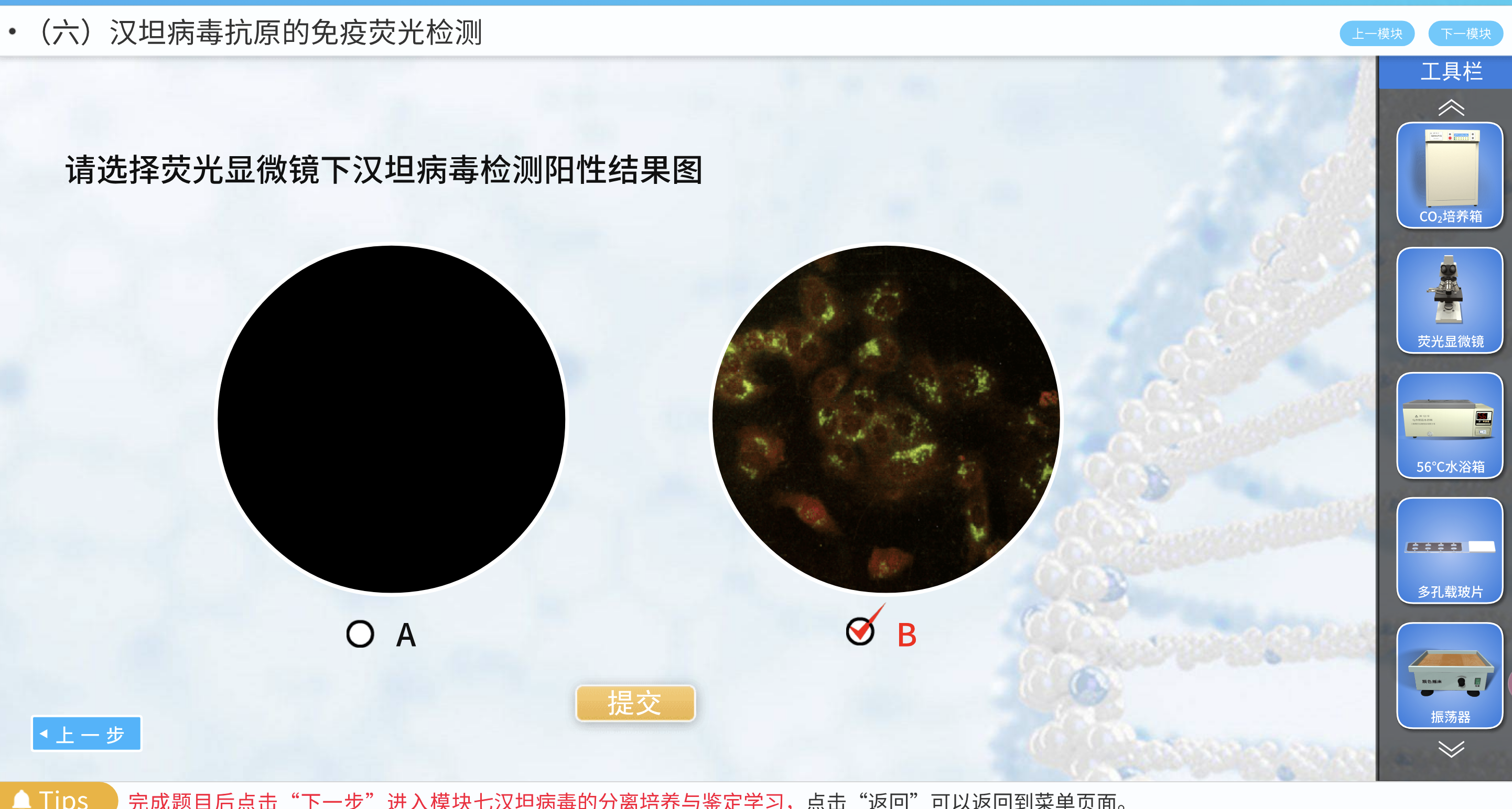 😅2分的微生物虚拟仿真(图片比较多,刷新+等待)https://www.ilab-x.com/details/page?id=12120 这个是3min的课程广告(-) 🦠汉坦病毒-copy from somewhere…实验原理实验原理评分细则实验操作❗不包的。⚠️操作步骤只截取了可能选错扣分的,其它的无脑点击,也可以参考 评分细则 ;最后的选择题分值较大。💡第一次选错是不扣分的,第二次会扣分。剩下一个拖进去【严格按顺序拖动】口罩-帽子-防护服-眼镜-鞋子-手套酒精56 C 水浴箱,工具栏可以翻页封板膜37C恒温箱【服了】洗板机后续照着点,封板+37度恒温箱选离心管胰蛋白酶37C 恒温箱倒置显微镜【not 荧光】多孔载波片冰箱湿盒至于37度恒温箱振荡器湿盒至于37度恒温箱 【梅开二度】振荡器【梅开二度】荧光显微镜无菌刻度吸管37度恒温箱倒置显微镜空白培养瓶CO2 培养箱酒精无菌刻度吸管孵育-CO2培养箱倒置显微镜酒精传播途径-全选B-不是显性感染这个是选错的这个是答案:(