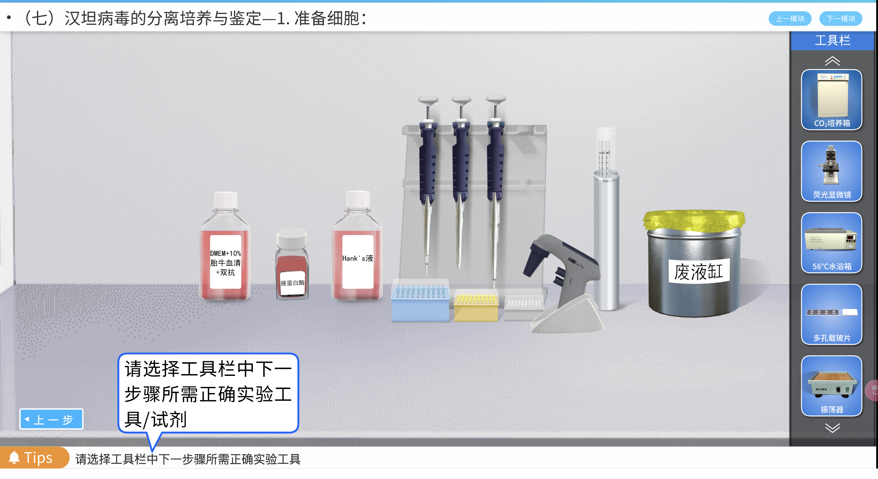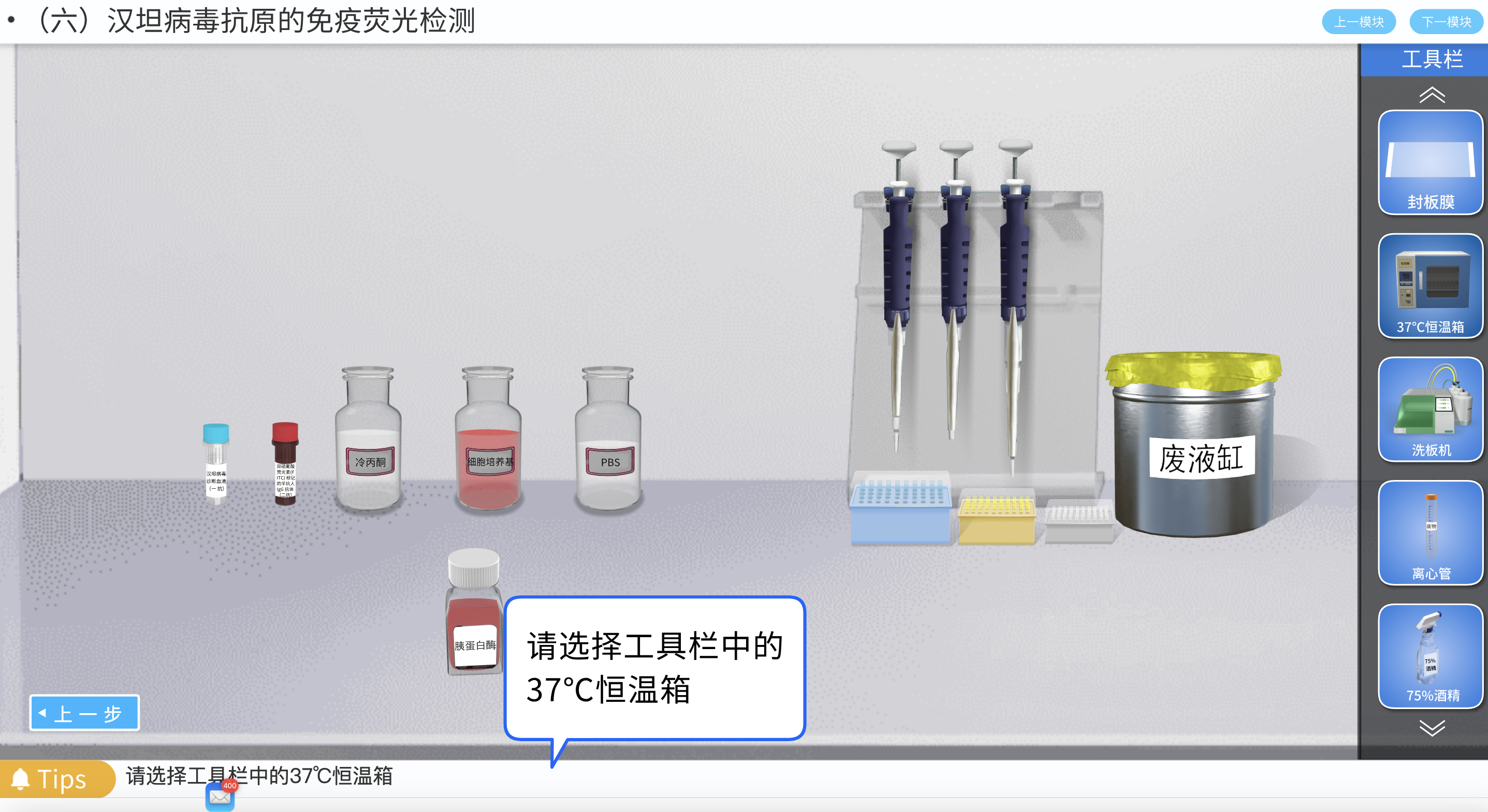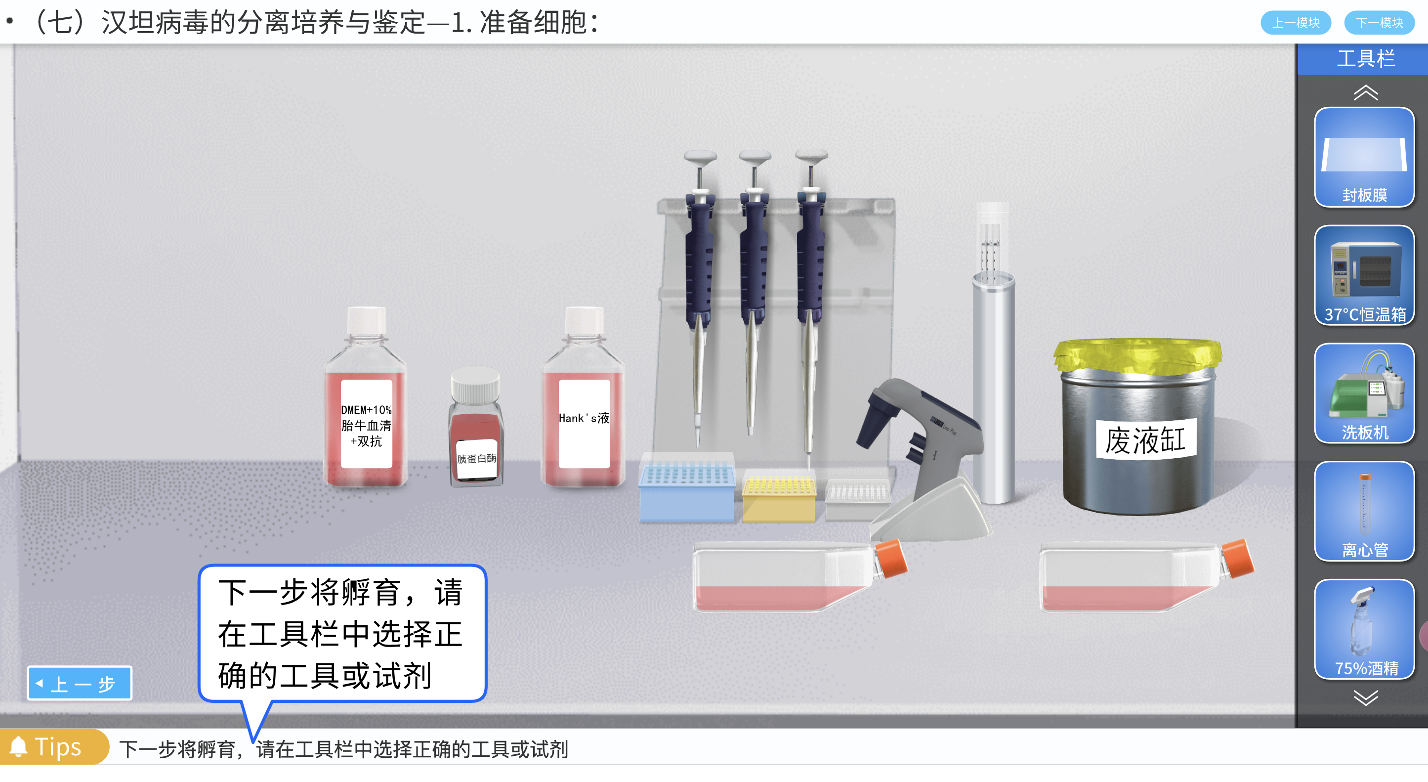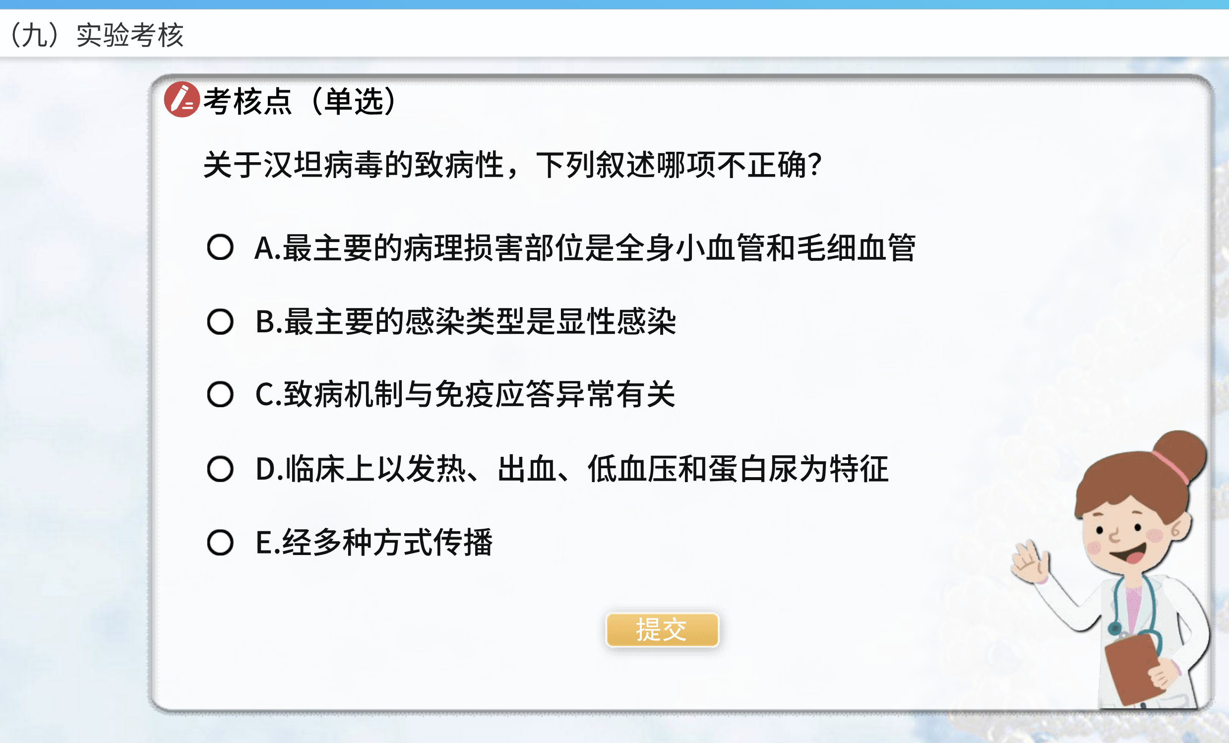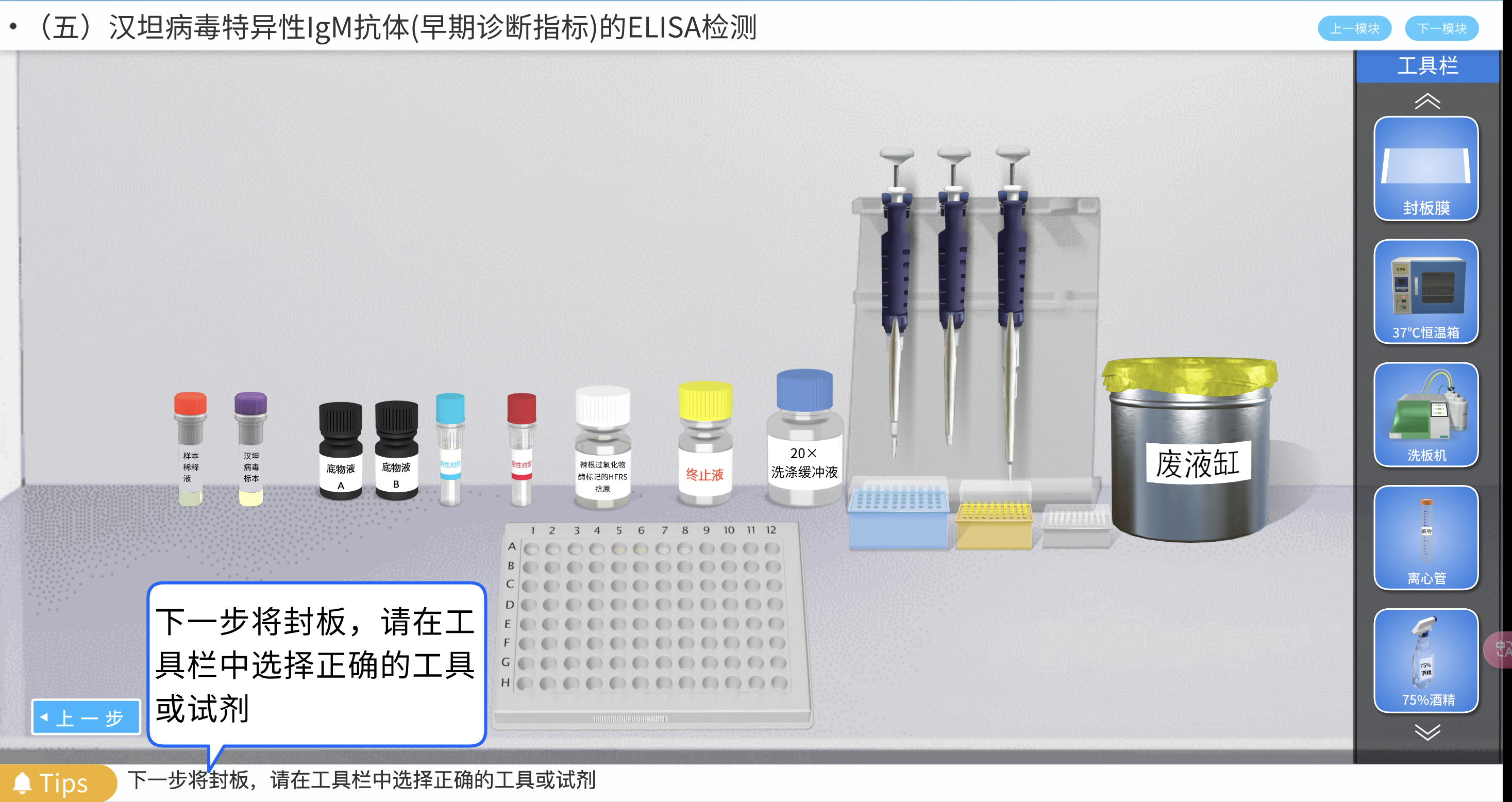 😅2分的微生物虚拟仿真(图片比较多,刷新+等待)https://www.ilab-x.com/details/page?id=12120 这个是3min的课程广告(-) 🦠汉坦病毒-copy from somewhere…实验原理实验原理评分细则实验操作❗不包的。⚠️操作步骤只截取了可能选错扣分的,其它的无脑点击,也可以参考 评分细则 ;最后的选择题分值较大。💡第一次选错是不扣分的,第二次会扣分。剩下一个拖进去【严格按顺序拖动】口罩-帽子-防护服-眼镜-鞋子-手套酒精56 C 水浴箱,工具栏可以翻页封板膜37C恒温箱【服了】洗板机后续照着点,封板+37度恒温箱选离心管胰蛋白酶37C 恒温箱倒置显微镜【not 荧光】多孔载波片冰箱湿盒至于37度恒温箱振荡器湿盒至于37度恒温箱 【梅开二度】振荡器【梅开二度】荧光显微镜无菌刻度吸管37度恒温箱倒置显微镜空白培养瓶CO2 培养箱酒精无菌刻度吸管孵育-CO2培养箱倒置显微镜酒精传播途径-全选B-不是显性感染这个是选错的这个是答案:(