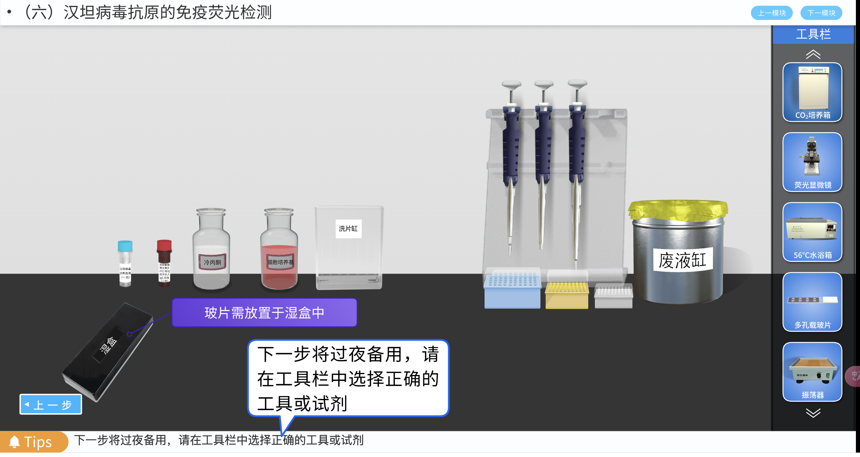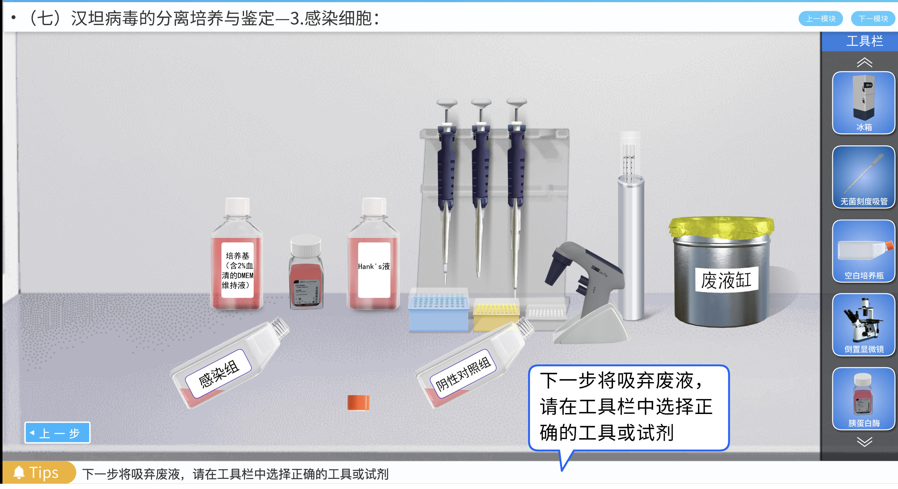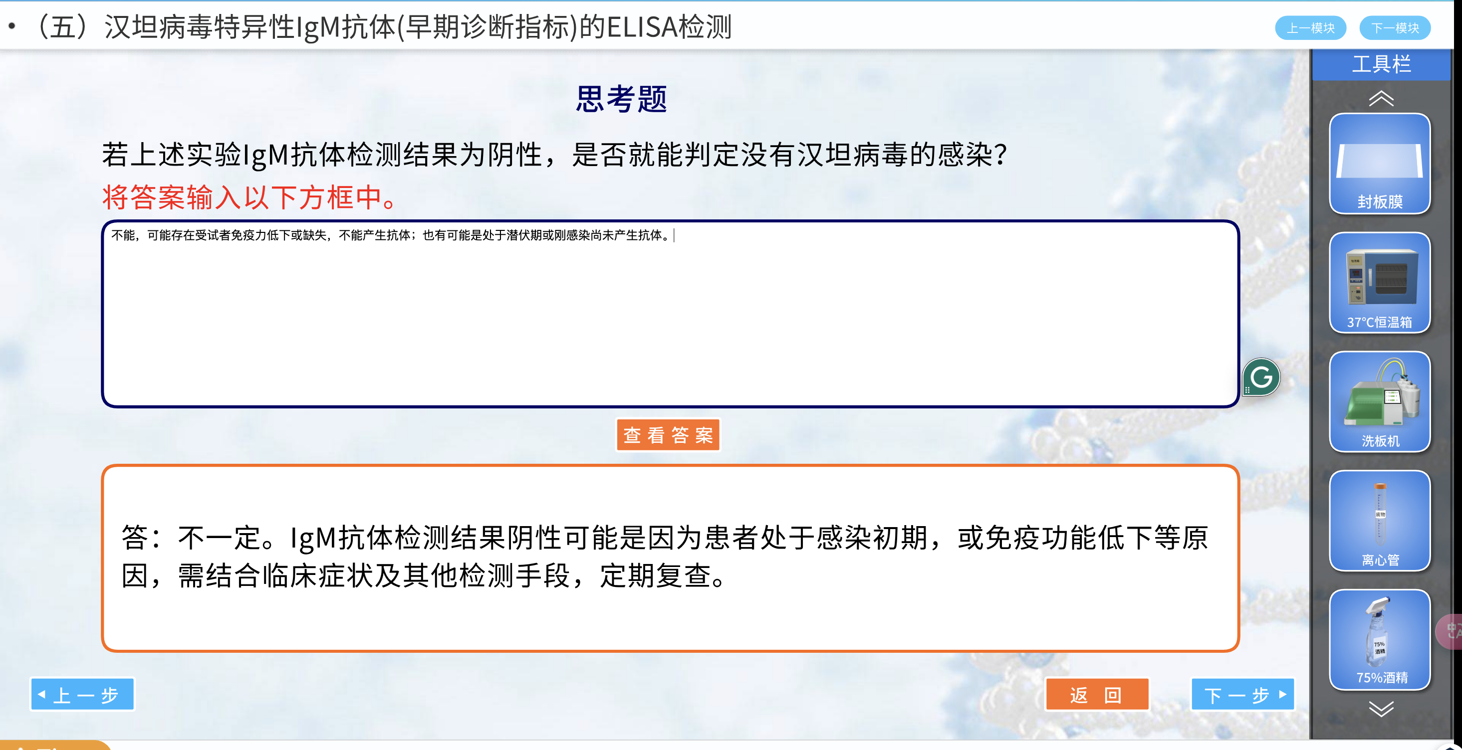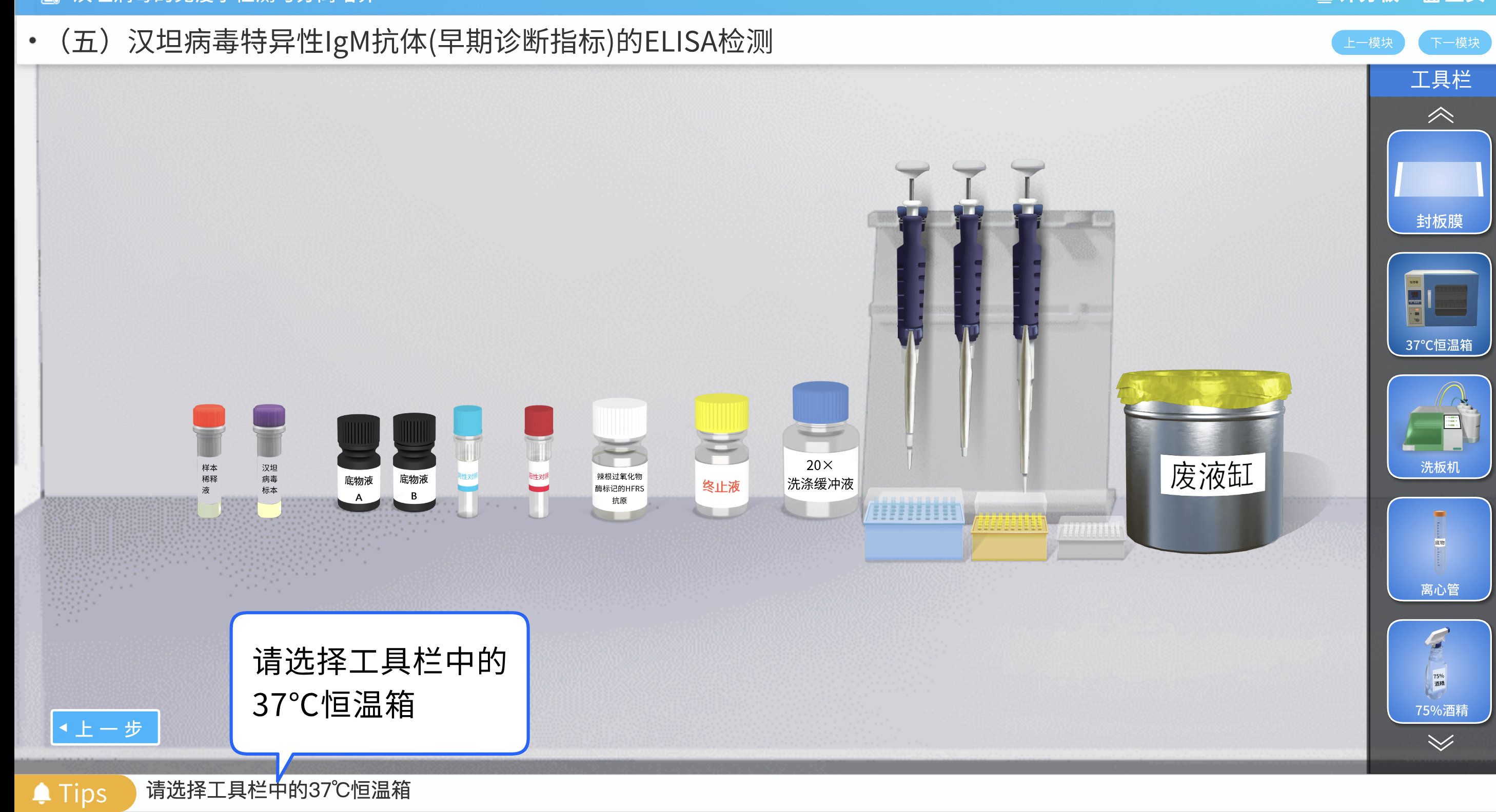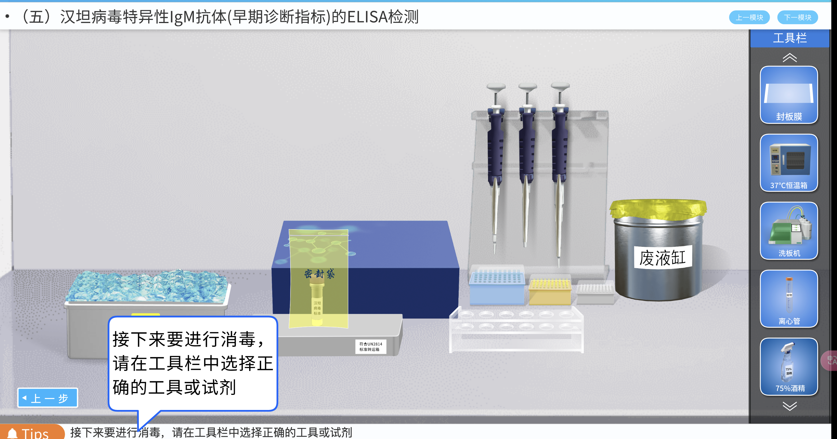 😅2分的微生物虚拟仿真(图片比较多,刷新+等待)https://www.ilab-x.com/details/page?id=12120 这个是3min的课程广告(-) 🦠汉坦病毒-copy from somewhere…实验原理实验原理评分细则实验操作❗不包的。⚠️操作步骤只截取了可能选错扣分的,其它的无脑点击,也可以参考 评分细则 ;最后的选择题分值较大。💡第一次选错是不扣分的,第二次会扣分。剩下一个拖进去【严格按顺序拖动】口罩-帽子-防护服-眼镜-鞋子-手套酒精56 C 水浴箱,工具栏可以翻页封板膜37C恒温箱【服了】洗板机后续照着点,封板+37度恒温箱选离心管胰蛋白酶37C 恒温箱倒置显微镜【not 荧光】多孔载波片冰箱湿盒至于37度恒温箱振荡器湿盒至于37度恒温箱 【梅开二度】振荡器【梅开二度】荧光显微镜无菌刻度吸管37度恒温箱倒置显微镜空白培养瓶CO2 培养箱酒精无菌刻度吸管孵育-CO2培养箱倒置显微镜酒精传播途径-全选B-不是显性感染这个是选错的这个是答案:(
